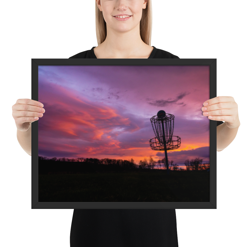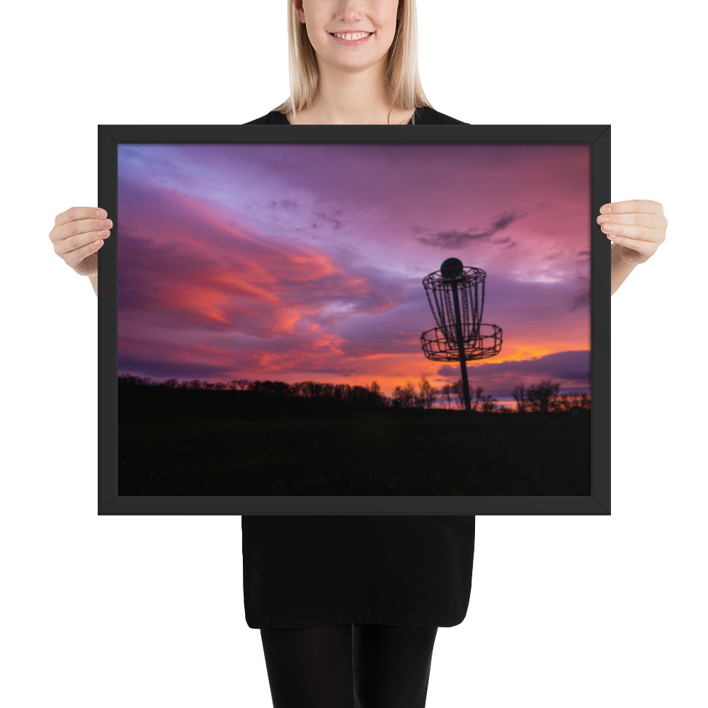 The photo featured was taken at Twin Grove hole 9, in Pine Grove, PA. 21 April 2021, we were there for the Cubby Memorial weekend. I was sleeping in the recliner in cabin A72 and I woke up randomly at about 6:30am. All the windows were this eerie purple and I grabbed the camera and quietly snuck out to not wake up anyone else. The cabin is right next to hole 7, and a short walk to hole 9 which features a basket at the top of a wide open hill with no trees nearby. I took about 70 pictures before the colors faded to a dull yellow. This was my favorite one of the day and one of my favorites ever. That's why it's my first choice to be featured this way. -Dave Cox